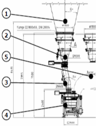 靠一套通氣系統(tǒng)(2)支持,煤粉從煤粉倉(1)流出,轉(zhuǎn)子秤(4)將煤粉進(jìn)行定量喂料,傳送空氣(5)從風(fēng)機(jī)中出來,并將煤粉直接吹到燃燒器。轉(zhuǎn)子秤喂料的高精度確保燃燒器中穩(wěn)定的空氣/煤粉混合。使用一個(gè)下料管(3)將煤粉倉出口與轉(zhuǎn)子秤(4)相連。