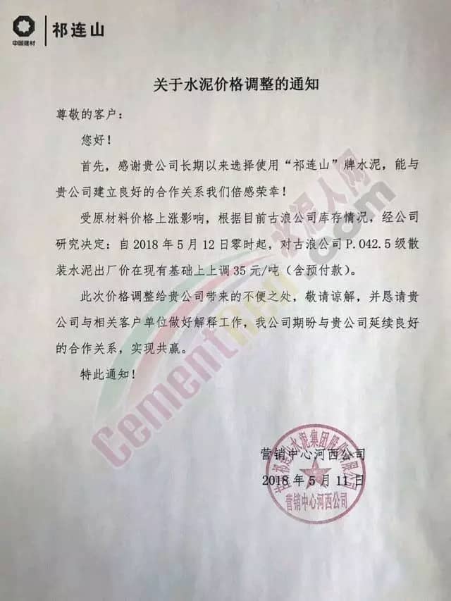 甘肅古浪祁連山水泥價格調整通知稱:受原材料價格上漲影響,根據(jù)目前祁連山水泥古浪公司庫存情況,公司研究決定,自5月12日零時起,對古浪公司P.O42.5級散裝水泥出廠價上調35元/噸(含預付款)。