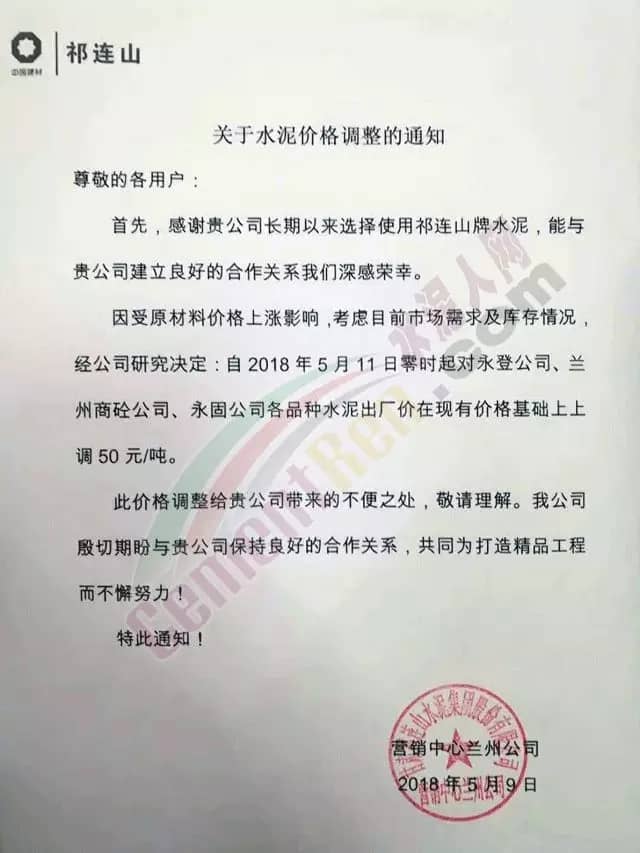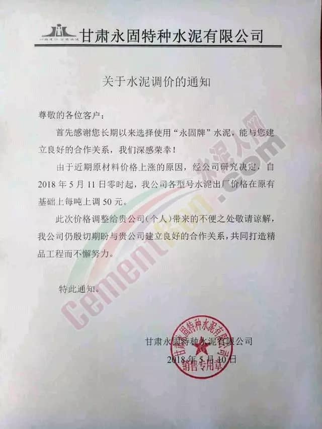 甘肅永固特種水泥有限公司調價通知稱,由于近期原材料價格上漲原因,經(jīng)公司研究決定自5月11日零點起,各型號水泥出廠價格在原基礎上上調50元/噸。