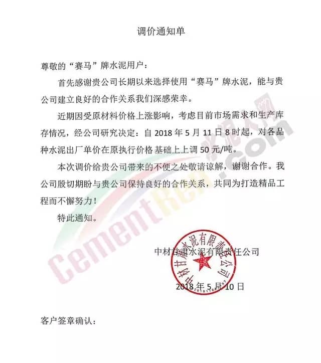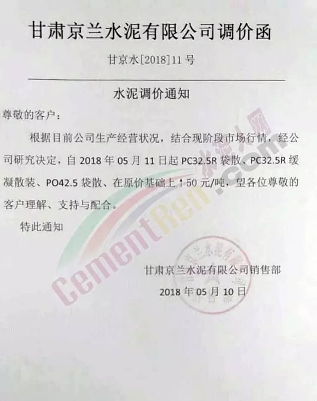 中材甘肅水泥有限責任公司調價通知稱,近期因受原材料價格上漲影響,考慮目前市場需求和生產庫存情況 ,經(jīng)公司研究決定 自5月11日8時起,對各品種水泥出廠單價在原執(zhí)行價格基礎上上調50元/噸。