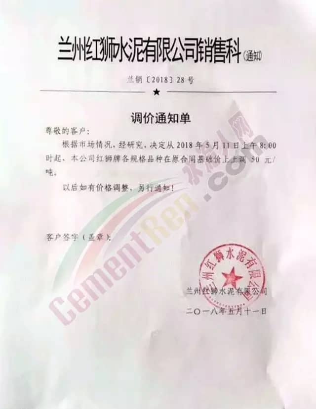 蘭州紅獅水泥有限公司調價通知稱,根據(jù)市場情況,經(jīng)研究決定從5月11日上午8點起,紅獅牌各規(guī)格品種在原合同基礎價上上調50元/噸。