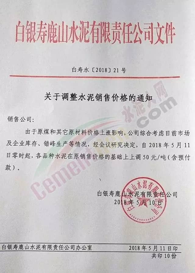 白銀壽鹿山水泥有限責任公司調價通知稱:由于原煤和其他原材料價格上漲影響,公司綜合考慮目前市場及企業(yè)庫存、錯峰生產等情況,經(jīng)會議研究決定 ,自5月11日零時起,各品種水泥在原銷售價格的基礎上上調50元/噸(含預付款)