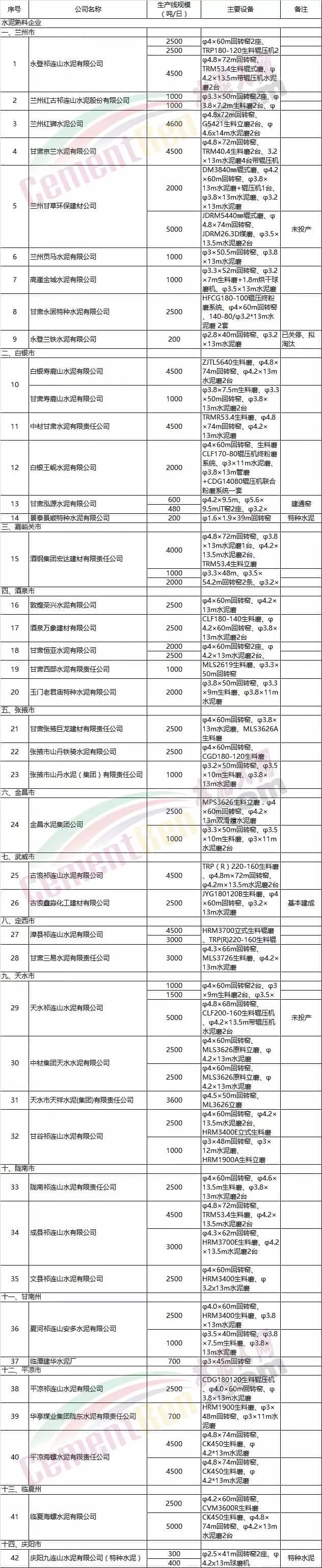 據(jù)水泥人網(wǎng)信息部統(tǒng)計數(shù)據(jù)顯示,甘肅省水泥熟料產能在4000萬噸/年以上,生產線名單如下: