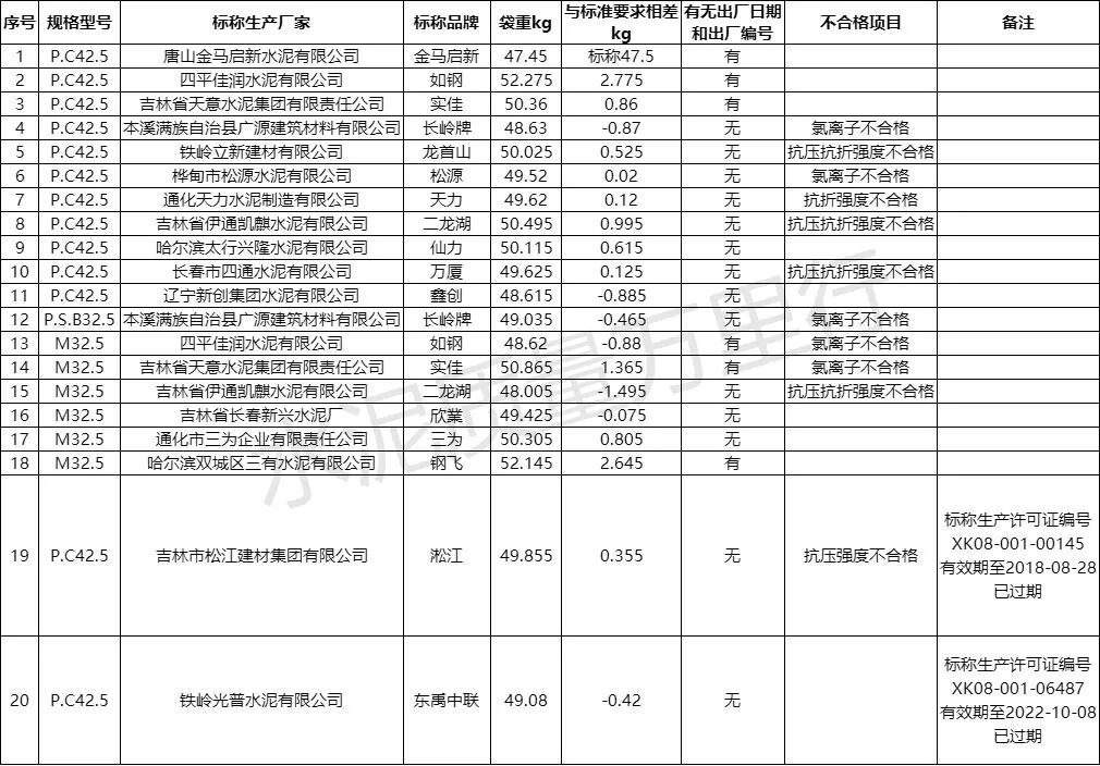 抗壓抗折強度不合格直接關系水泥使用性能,6批次相關不合格產(chǎn)品涉及吉林省伊通凱麒水泥有限公司、鐵嶺立新建材有限公司、通化天力水泥制造有限公司、長春市四通水泥有限公司、吉林市松江建材集團有限公司等企業(yè)。